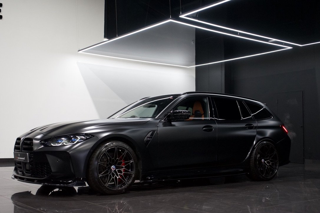 2023 BMW M3 3.0 BiTurbo Competition M Touring 5dr Petrol Steptronic xDrive finished in Satin Black Wrap by Topaz in excess of £5000 Contrasting With Full Merino Bicolour Leather - Black-Kyalami Orange Interior. This vehicle comes with: FULL BMW SERVICE HISTORY, Virtual Dash, M Head Up Display, 19in Front - 20in Rear Alloy Wheels - M Double Spoke - 826 - Forged - Bicolour Black, Parking Assistant Plus, Visibility Pack, Driver Recorder, Comfort Pack, Technology Plus Pack, M Sports Exhaust System, Harmon Kardon Surround Sound System, 360 View Cameras, Front and Rear Parking Sensors, Front Heated Seats, Heated Steering Wheel, Ambient Lighting, plus much more...